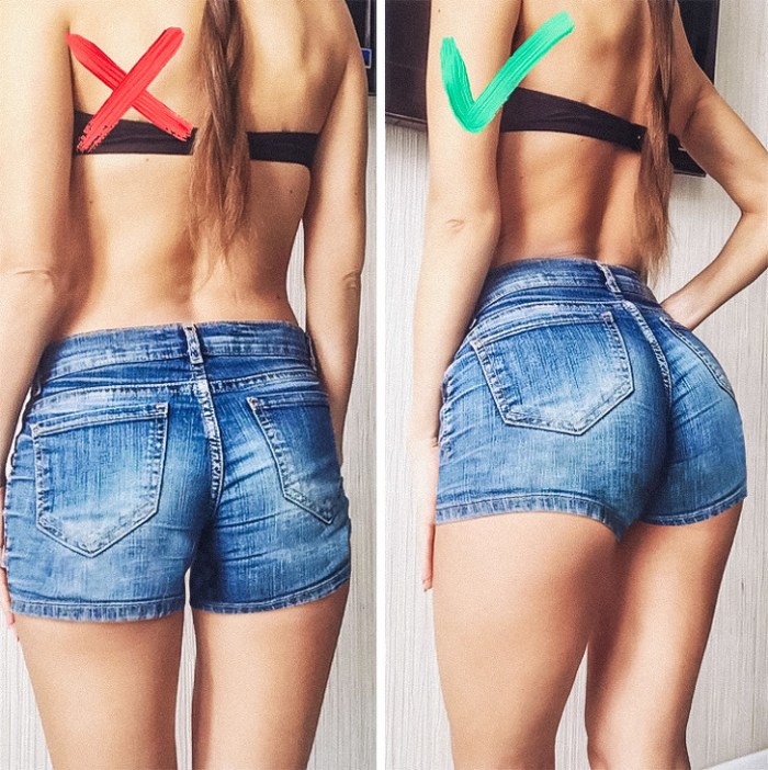 אחת מהדברים החשובים לתמונות טובות של הישבן הנשי או קימור טוב של הגב התחתון. ככל שהקימור עגול יותר, כך הישבן שלך יהיה עגול יותר. הנה כמה טיפים לבחירת הבגדים כשזה מגיע לג'ינס, מכנסיים קצרצרים או ביקיני: כדאי למשוך אותם מעט גבוה יותר מהרגיל, הטריק הזה יגרום לגוף שלכן להיראות יותר מחוטב.