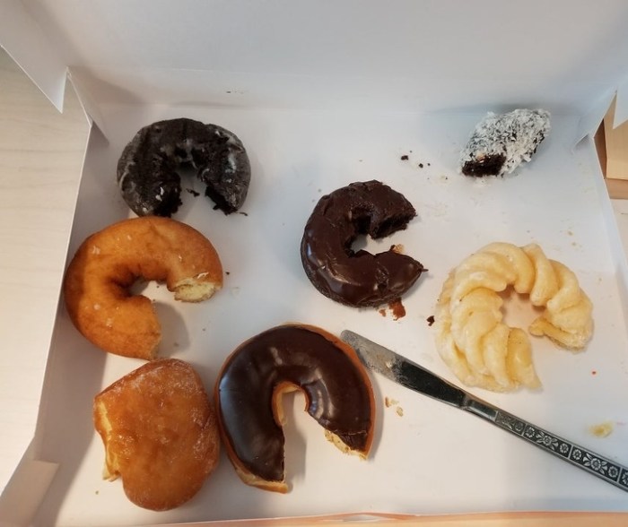 קולגה של חבר שלי חתך חתיכה מכל סופגנייה שבקופסה.<