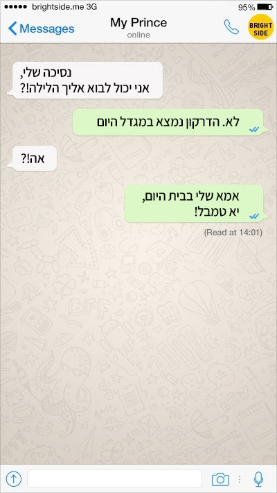מאז עידן הסמארטפון, צורת התקשורת שלנו השתנתה, לטוב ולרע. אפשר להזמין לדייט יותר בקלות, וגם לבטל דייט באותה קלות. אפשר לשלוח סמיילי ששולח נשיקות ולהצהיר על האהבה שלנו באמצעות אימוג’ים, וגם לסנן את החיים…נכון, תקשורת ישירה היא עדיפה, אבל אז לא היו לנו צילומי מסך קורעים מצחוק של שיחות וואצאפ, וכשזה בין זוגות או אנשים שרק התחילו לצאת – זה פשוט פרייסלס!קבלו 12 שיחות וואצאפ היסטריות של אנשים שפשוט אין להם זמן לרומנטיקה!