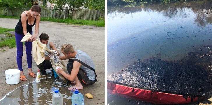 11. אנשים ב-ברסט (בלארוס) מנקים את הברבורים באגם אחרי שנשפך בו נפט