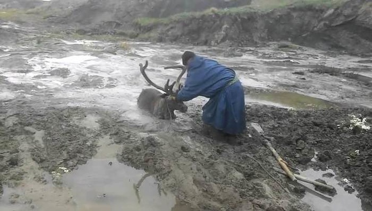 7. שני אנשים נכנסו בגשם לנהר כדי לחלץ משם צבי שנתקע