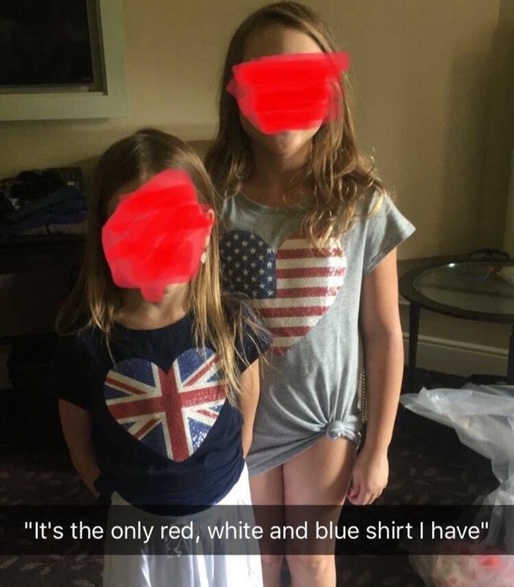 על התמונה כתוב: ‘זו החולצה היחידה שיש לי בצבעים כחול, אדום ולבן’
