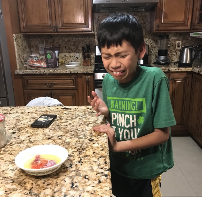 ״אחי הקטן התכוון לטגן ביצה אבל פתח בטעות ביצת בלוט (מאכל אסייתי של ביצה מותססת עם עובר של ברווז). כעת הוא בוכה כי הוא חושב שהוא הרג את הציפור״
