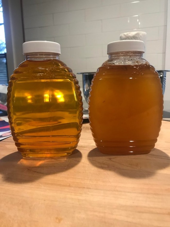 דבש שנלקח מאותן הדבורים – הצנצנת משמאל במהלך הסתיו והצנצנת מימין במהלך הקיץ.