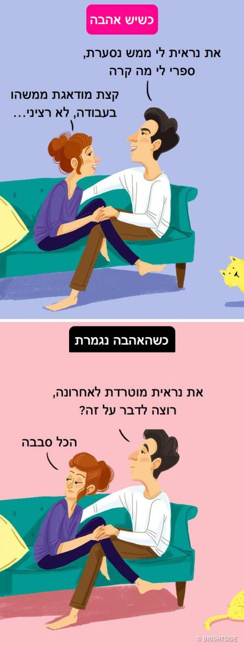 כולנו יודעים שכל אהבה או מערכת יחסים, יכולה להגיע ל”מבוי סתום”, שלא לומר – הסוף.אז נכון, בזוגיות ארוכה, גם כשיש אהבה, הרומנטיקה נשחקת, אנחנו מגלים תכונות אצל בני הזוג שלנו, שפחות נראות לנו פתאום ובכלל “פחות זורם” מבעבר, וזה טבעי.אבל כשיש את הבסיס להכל – אהבה, אפשר להתגבר על קשיים, לעבור תקופות פחות טובות ולעשות מאמץ לשפר ולהשתפר.אלא אם כן, האהבה נעלמה לה… 8 האיורים הבאים (שהם מציאותיים וגם קצת עצובים) ממחישים מה קורה כשבת הזוג כבר לא אוהבת (בטח לא כמו שאהבה פעם), אם אתם רואים מצבים מוכרים מידי, אולי כדאי לבדוק את עצמכם – האם אתם עדיין אוהבים?