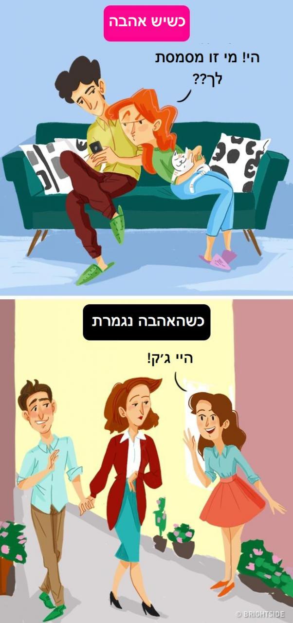 כולנו יודעים שכל אהבה או מערכת יחסים, יכולה להגיע ל”מבוי סתום”, שלא לומר – הסוף.אז נכון, בזוגיות ארוכה, גם כשיש אהבה, הרומנטיקה נשחקת, אנחנו מגלים תכונות אצל בני הזוג שלנו, שפחות נראות לנו פתאום ובכלל “פחות זורם” מבעבר, וזה טבעי.אבל כשיש את הבסיס להכל – אהבה, אפשר להתגבר על קשיים, לעבור תקופות פחות טובות ולעשות מאמץ לשפר ולהשתפר.אלא אם כן, האהבה נעלמה לה… 8 האיורים הבאים (שהם מציאותיים וגם קצת עצובים) ממחישים מה קורה כשבת הזוג כבר לא אוהבת (בטח לא כמו שאהבה פעם), אם אתם רואים מצבים מוכרים מידי, אולי כדאי לבדוק את עצמכם – האם אתם עדיין אוהבים?